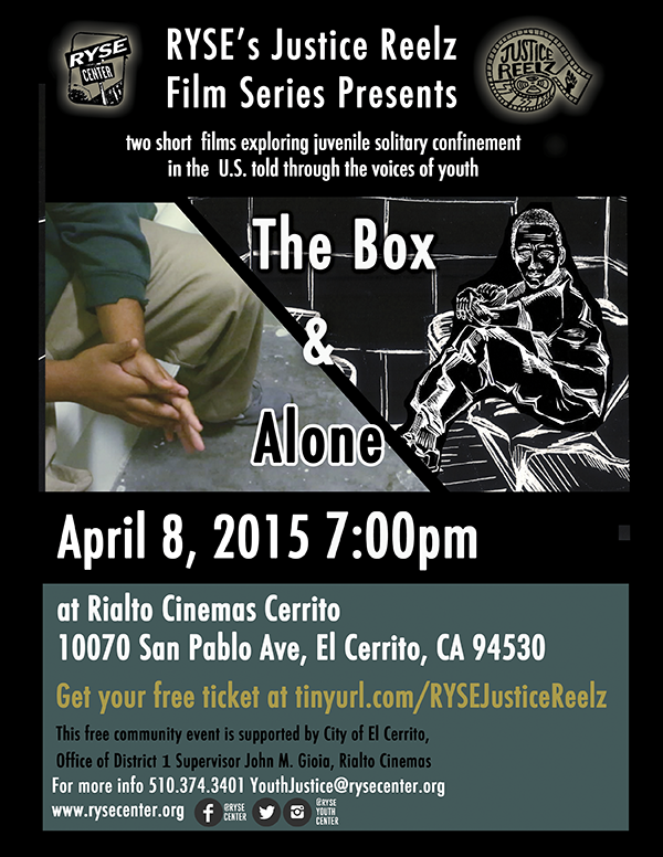 On April 8 at 7 p.m. RYSE Center in Richmond will be presenting two short films at the Cerrito on the subject of juvenile solitary confinement. Admission to the two movies—”The Box” and “Alone”—will be free. You can get your tickets by clicking on this link. This event is supported by the City of El Cerrito, the office of County Supervisor John Gioia, and Rialto Cinemas. Please come see these locally-produced documentaries on this important topic.